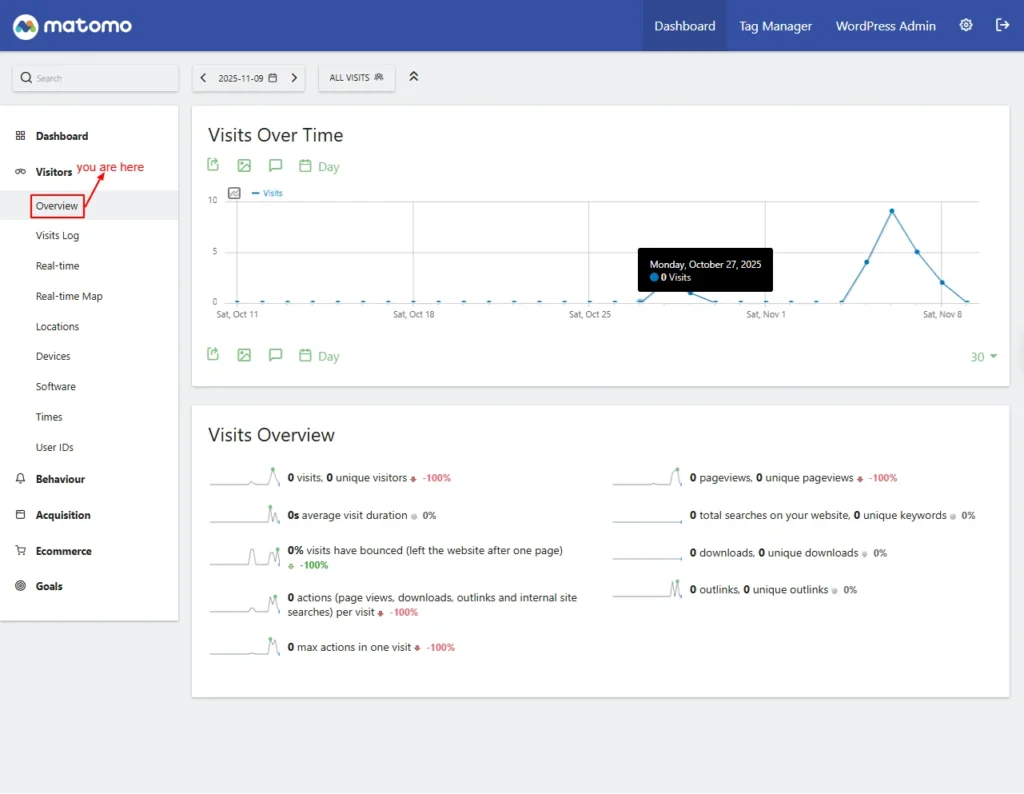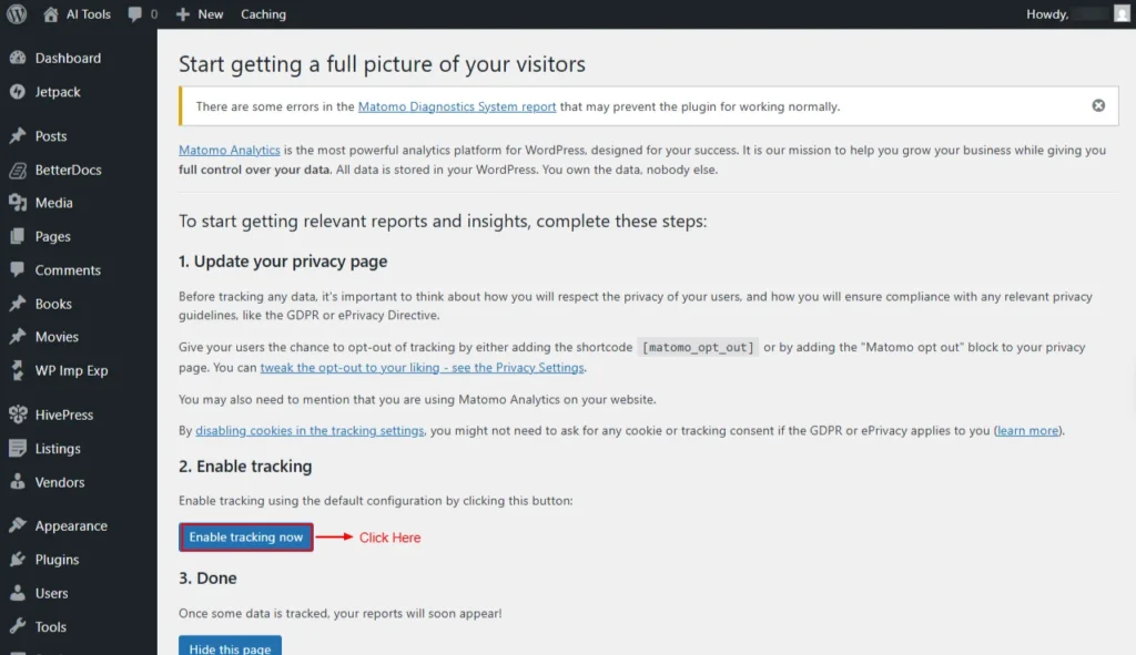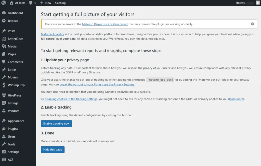 - How to activate visitor tracking, verify that Matomo is recording data, and avoid common setup mistakes.