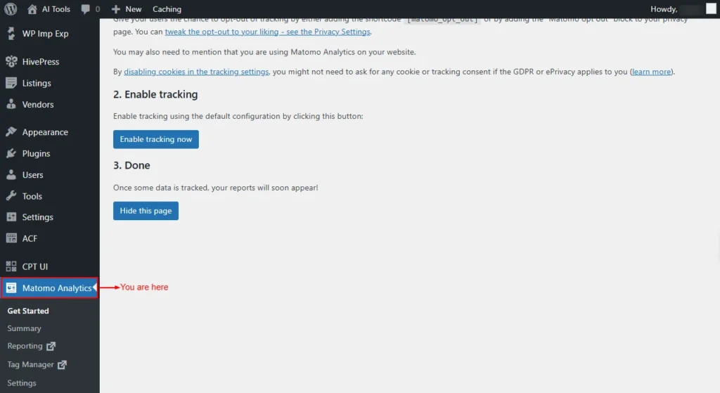 Before you begin tracking, you have to update your privacy page with information about how you will respect user privacy to comply with laws like the GDPR or ePrivacy. You may also need to mention that you are using Matomo Analytics by having an Analytics section on your privacy page.