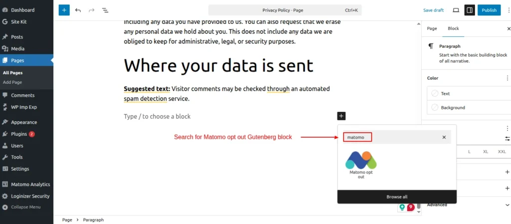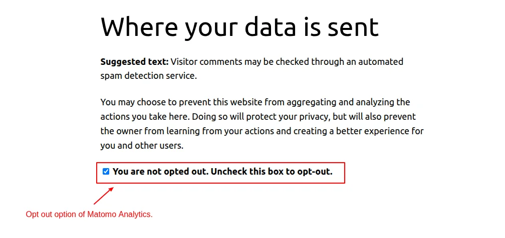 Next, provide your visitors with an easy opt-out option by adding the [matomo_opt_out] shortcode to your privacy page or using the Matomo opt-out Gutenberg block.