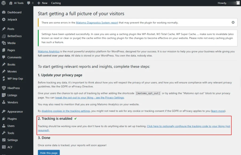 This means your tracking is up and running: no further setup is needed. If you’d like, you can click here to customize the tracking code, though it’s completely optional. After some visits are recorded, your reports will appear in the dashboard.