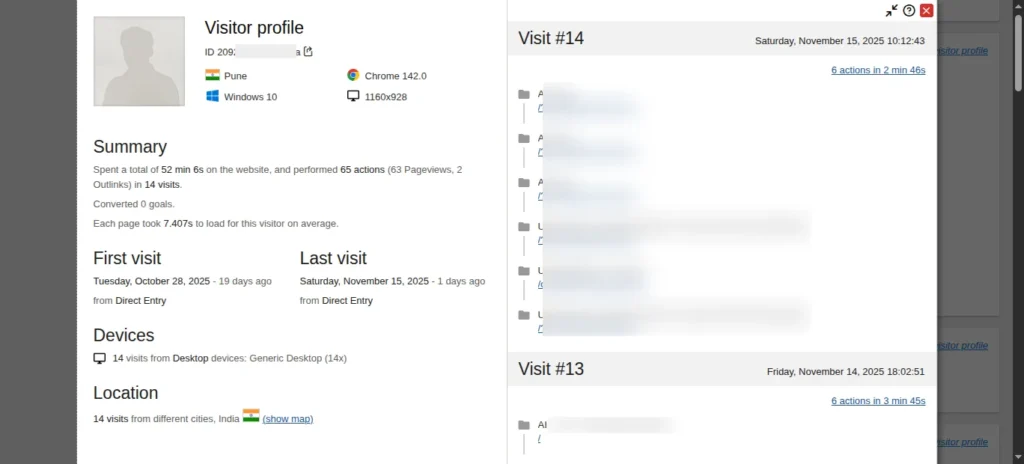 - Actions Taken: Action with duration. Below is a list of all pages the visitor opened during the session.