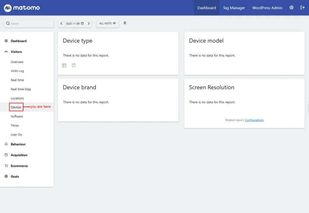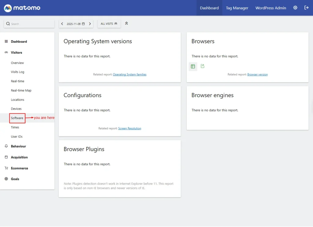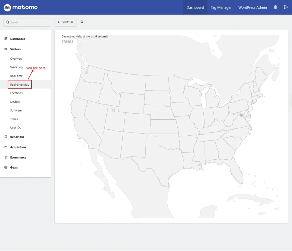 This menu gives a bird’s-eye view of all the metrics that are tracked by Matomo Analytics.