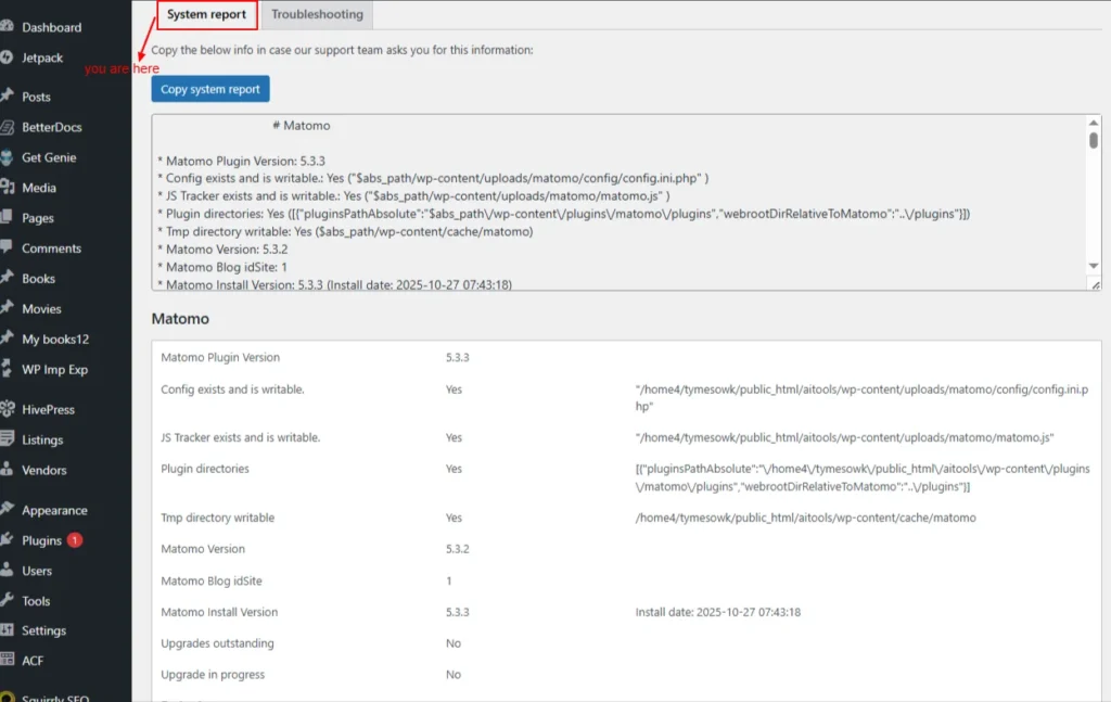 This page generates a system report, which can then be shared with the Matomom support team if needed.