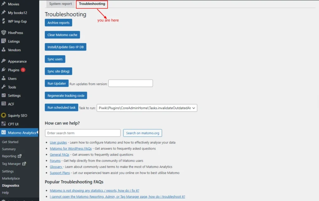 - Run Updater: Executes pending updates for Matomo’s database or internal components. Regenerate tracking code: Creates a fresh tracking code snippet in case any configuration has changed.