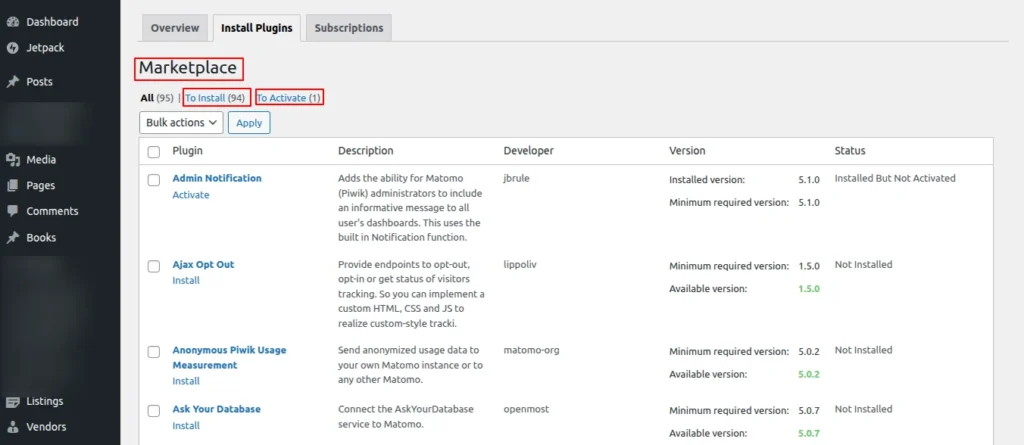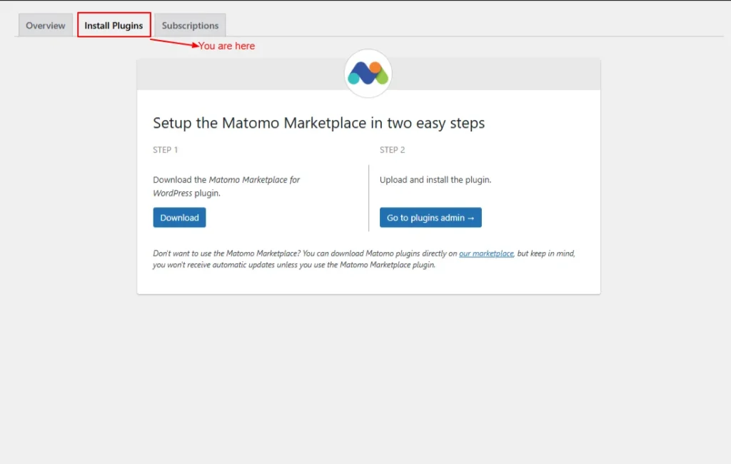 - If you prefer not to use the Matomo Marketplace, you can manually download plugins. Automatic updates work only when the Marketplace plugin is enabled.