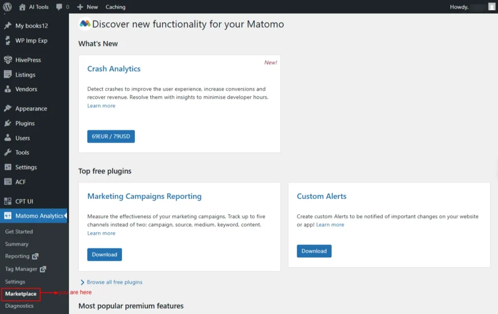 The Marketplace lets you browse, install, and manage additional Matomo plugins and features to extend your analytics capabilities.