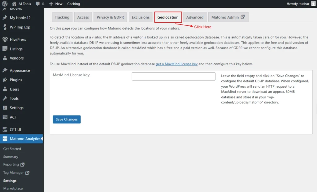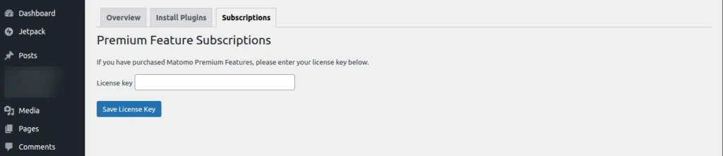 Leave the field blank to continue using DB-IP. If you add a MaxMind license key, WordPress will fetch a ~60 MB database from MaxMind and store it in wp-content/uploads/matomo.