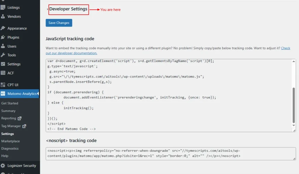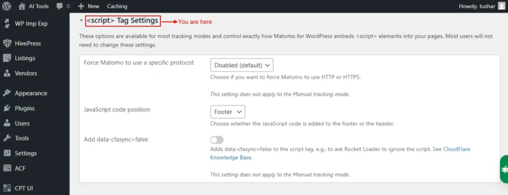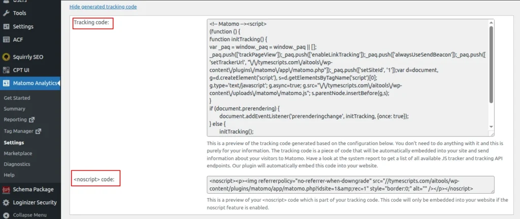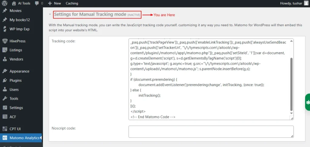 In Manual tracking mode, you can create and customize your own JavaScript tracking code as needed. Matomo for WordPress will then automatically embed this script into your site’s HTML.
