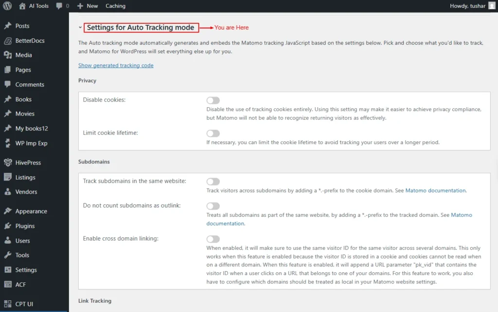 The Auto Tracking mode automatically creates and inserts the Matomo tracking JavaScript based on your selected settings. Simply choose what you want to track, and Matomo for WordPress will handle the rest.