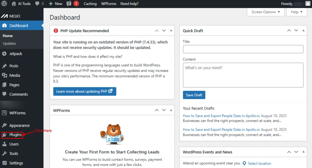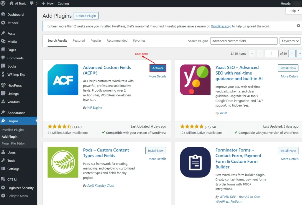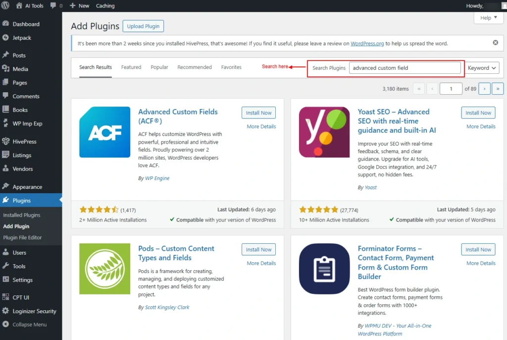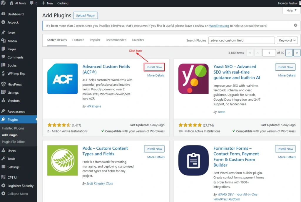 First, install the ACF Plugin. To do that, navigate to your WordPress dashboard.