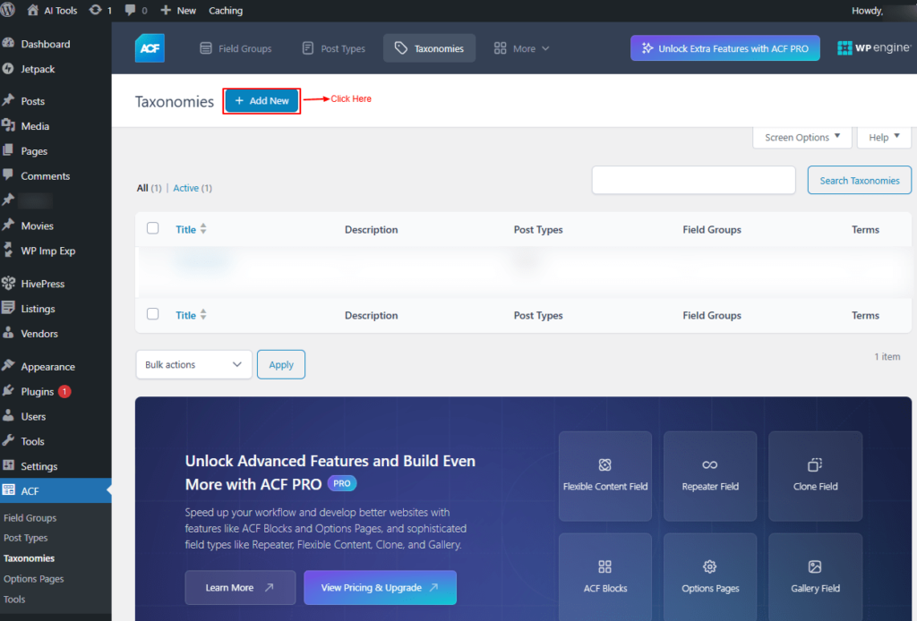 This section allows you to create taxonomies. To do that, go to the Taxonomies menu in the ACF main menu.