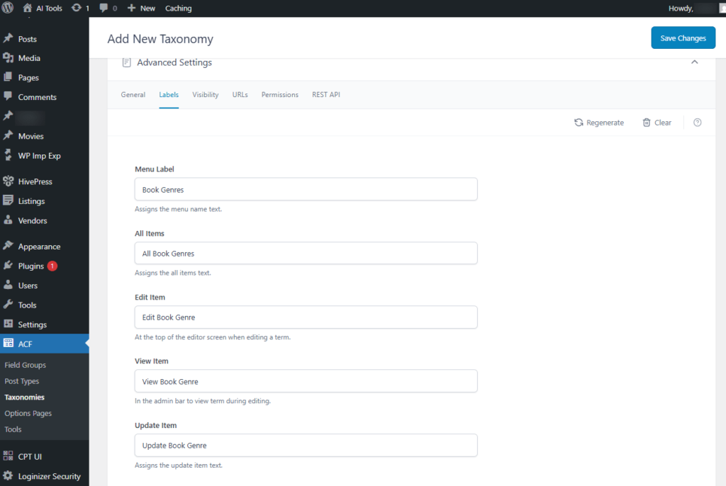 - View Item: Appears in the admin bar to view the term while editing. For e.g., View Book Genre.