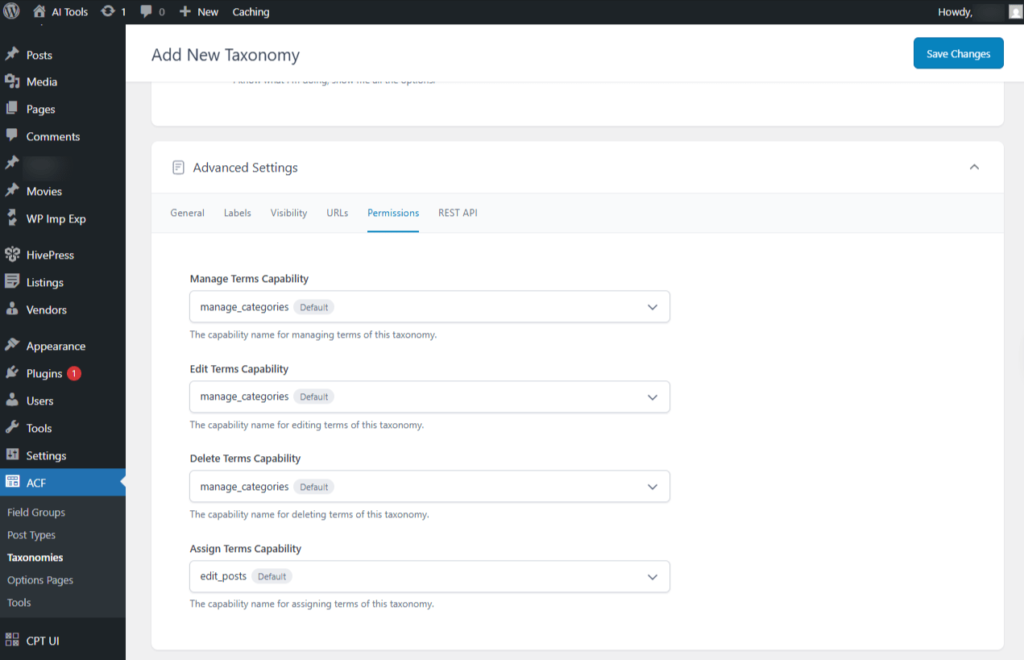 - Assign Terms Capability: The capability required to assign terms to this taxonomy.edit_posts(Default)