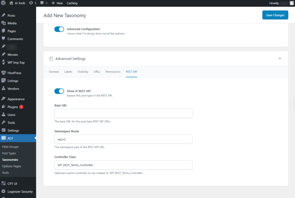 Screenshot 35: Add New Taxonomy → Advanced Settings → REST API