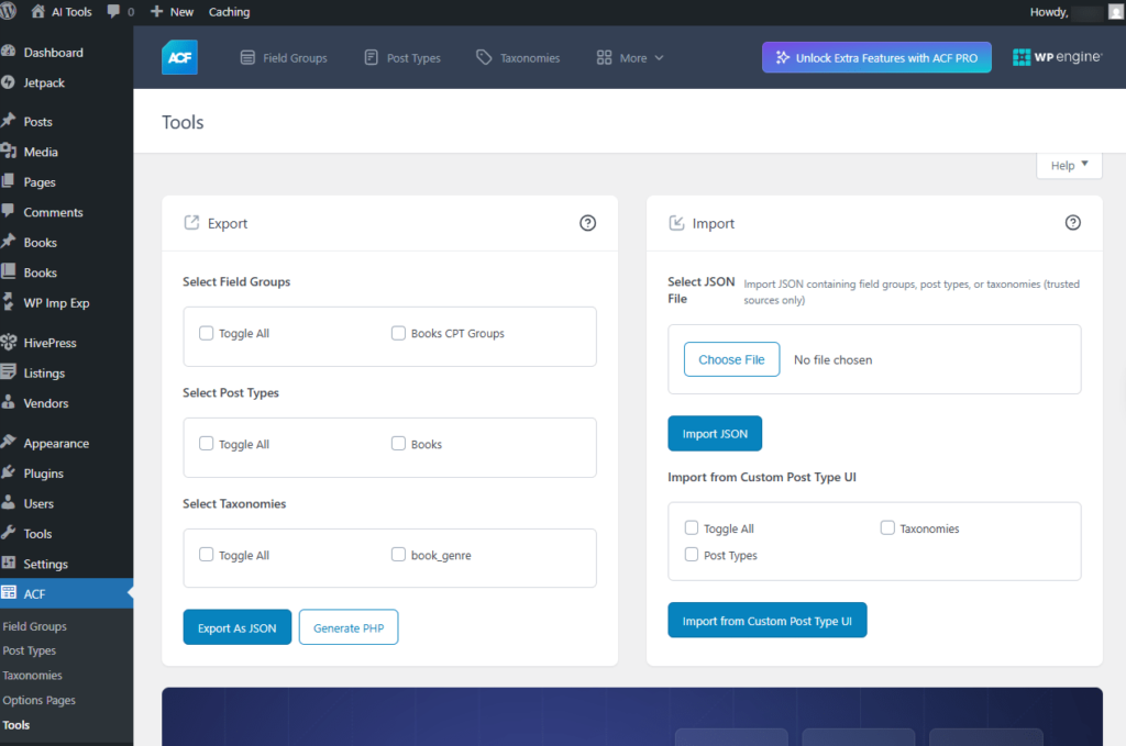 Using the tools menu, you can export and import ACF field groups, taxonomies, and custom post types as JSON.
