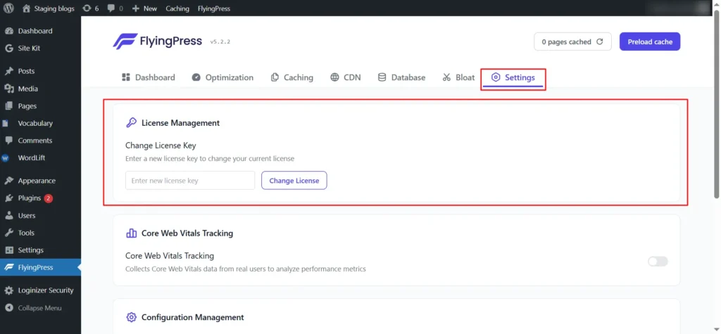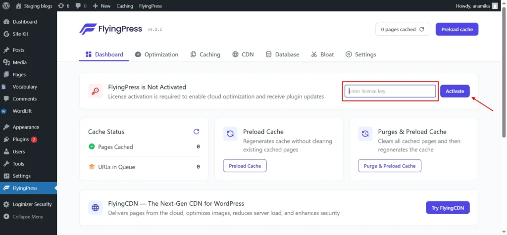 - Open the FlyingPress Dashboard and paste your license key → Activate License.