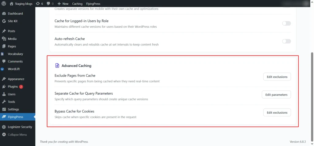 - Cache for Logged-in Users by Role:- For most blogs and informational sites, this setting can stay disabled. Enable it only for membership or content sites where logged-in users need personalized caching.