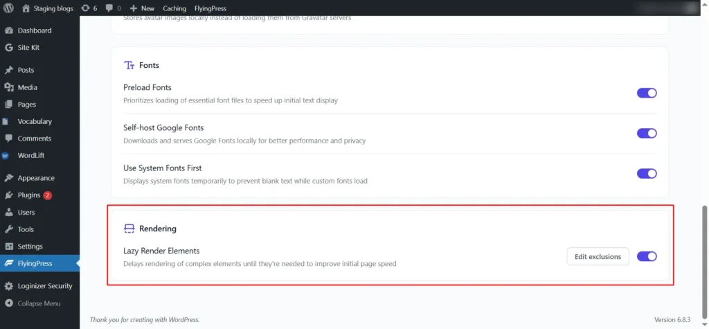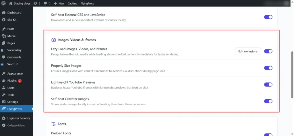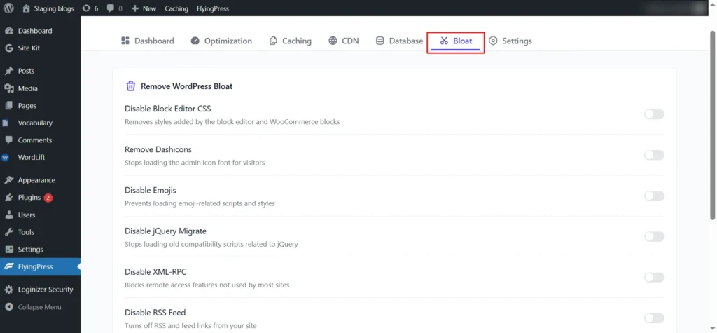 Next, let’s address WordPress bloat. Bloat occurs when unnecessary scripts, styles, or features load on your website, slowing it down. FlyingPress (or Perfmatters settings) lets you disable or optimize these features to streamline your site. Here’s how: