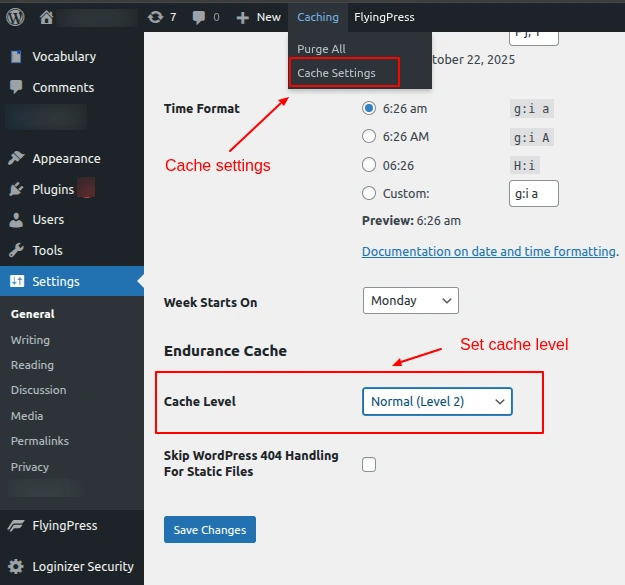 From the WordPress admin menu, go to Caching → Cache Settings. This opens the Endurance Cache configuration panel.