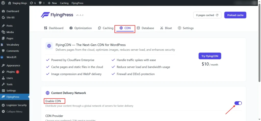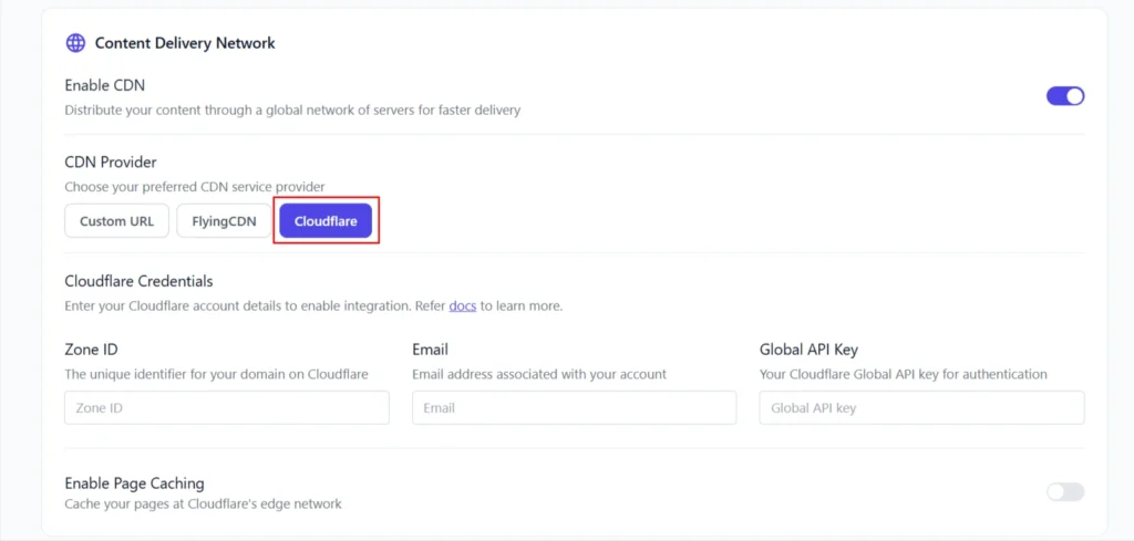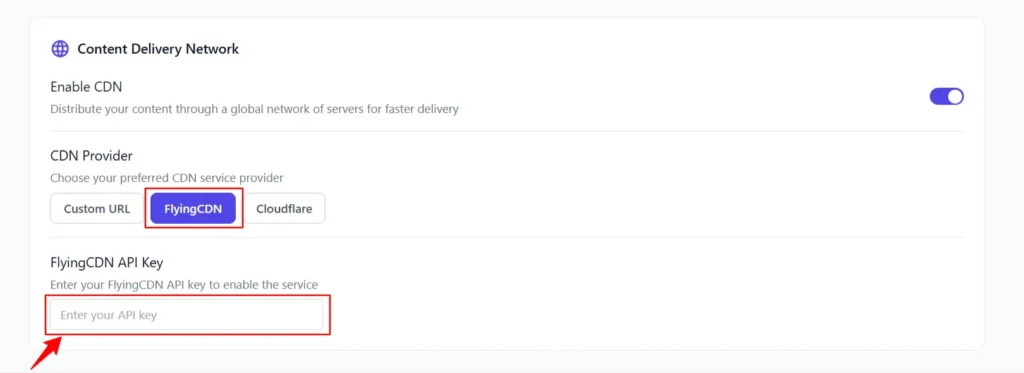 FlyingCDN is the premium option, offering advanced features and seamless integration with FlyingPress. Simply enter your API key, and FlyingPress handles the configuration automatically.