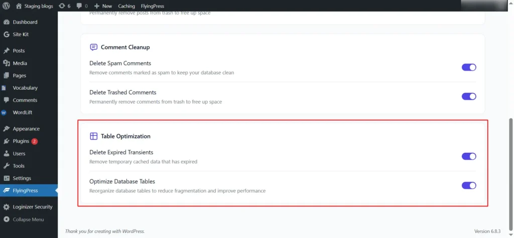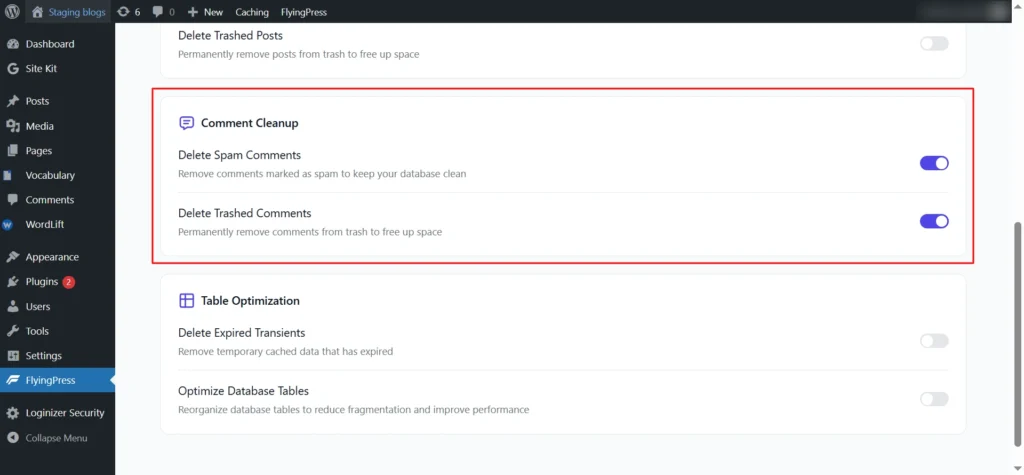 - Delete Trashed Comments:- Once enabled, FlyingPress will automatically remove every trashed comment from your website.