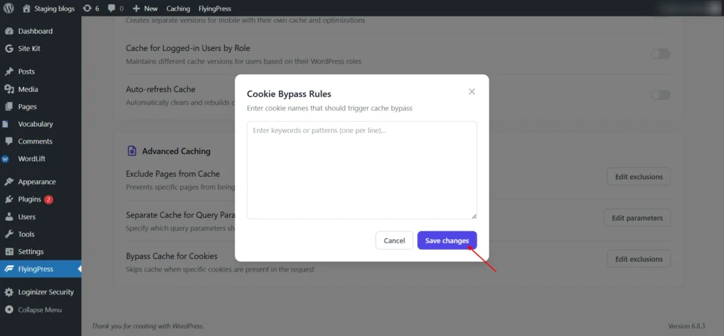 - Bypass Cache for Cookies: Similarly, you can bypass caching for specific cookies. Enter the cookie names in the bypass list, like (user_session for logged-in members), and FlyingPress will serve uncached pages for users with those cookies, perfect for logged-in users or personalized experiences.