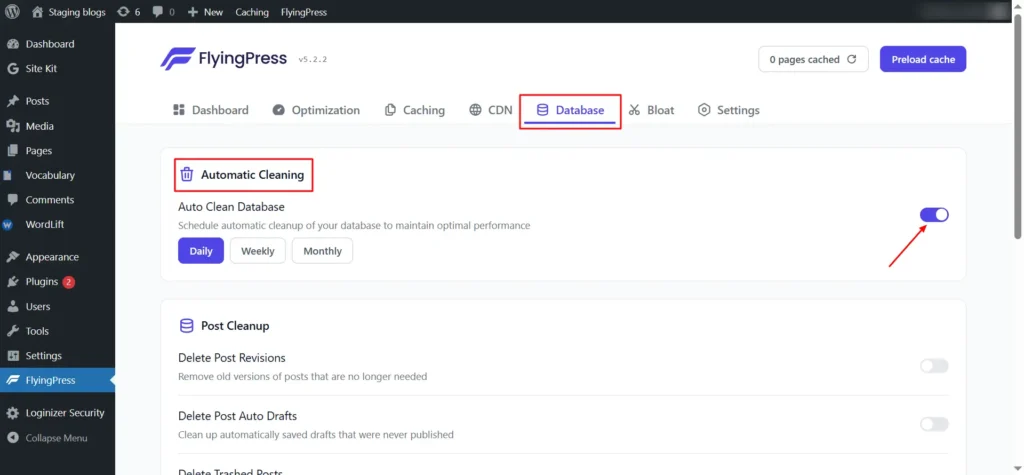 A clean, optimized database keeps your WordPress site fast. FlyingPress automates maintenance, letting you focus on content while your site runs smoothly. Database optimization in FlyingPress comes with four main sub-options. Let’s take a closer look at each option.