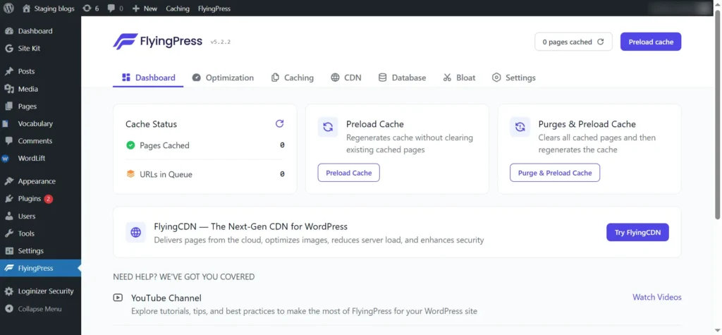 The FlyingPress dashboard provides essential cache management controls. From here, you can see:
