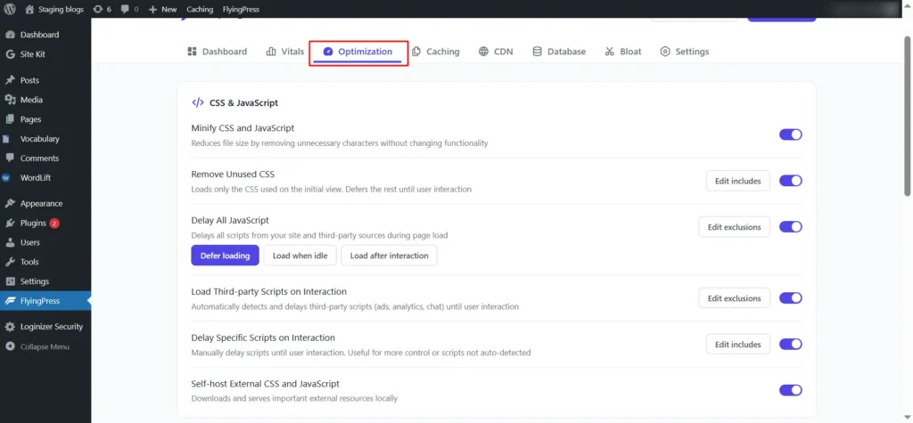 - Delay All JavaScript:- This feature lets you control when JavaScript files load to improve your site’s performance. FlyingPress offers three options: