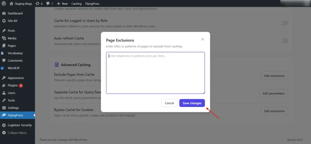 - Simply add the page’s permalink (like my-account) to the exclude list, and FlyingPress will skip caching it.