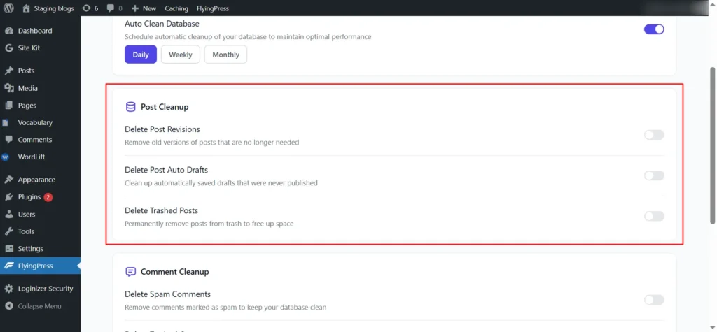 - Delete Spam Comments:- If comments are marked as spam, FlyingPress will automatically remove them, keeping your database lean.
