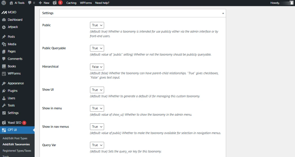 - Show UI: (Default: true) Determines whether a default user interface should be created for managing this custom taxonomy.