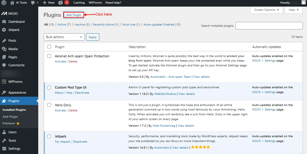 Go to the WordPress Dashboard of your website. From the left-hand navigation menu, go to the Plugin menu and click on it.