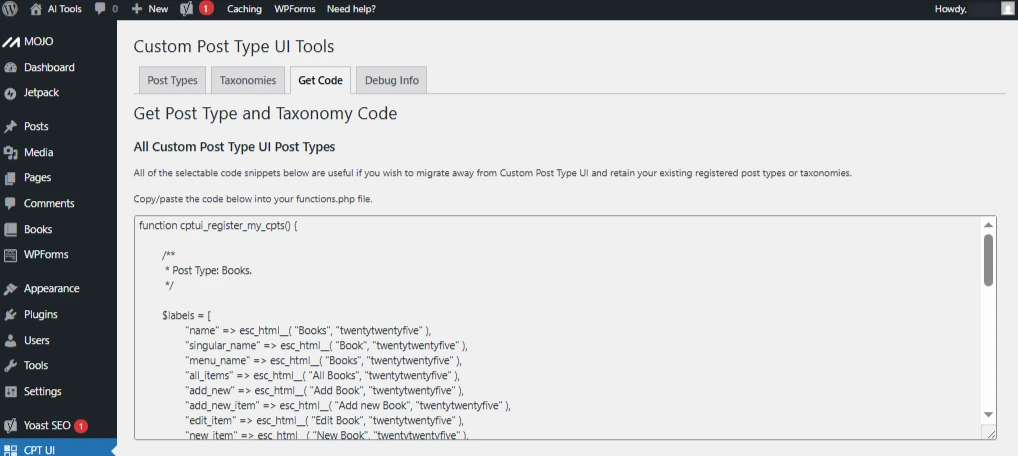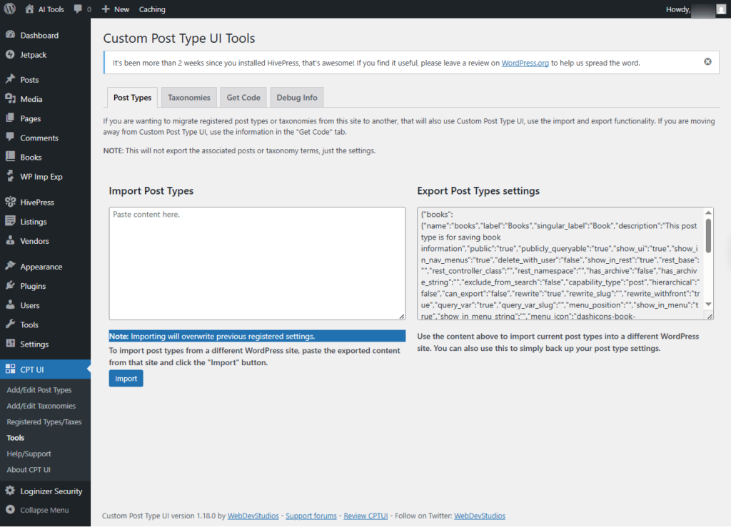 To migrate registered post types or taxonomies to another site using Custom Post Type UI, use the import/export feature. If moving to a site not using Custom Post Type UI, refer to the ‘Get Code’ tab.