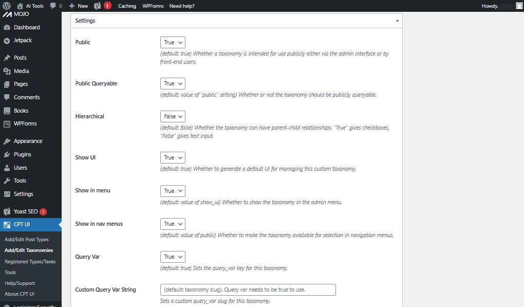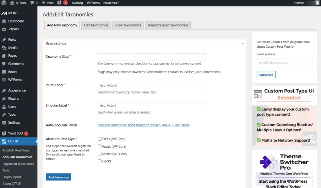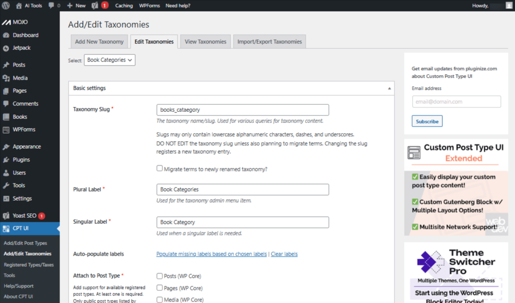 - Taxonomy Slug – Unique ID (cannot contain spaces, e.g., books_category).