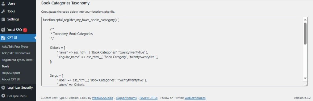 Get the PHP code for Custom Post Type and Taxonomy registered through CPT UI. This code snippets are useful for if for some reason you not might wan to use CPT UI further but want to retain your existing registered post types or taxonomies.
