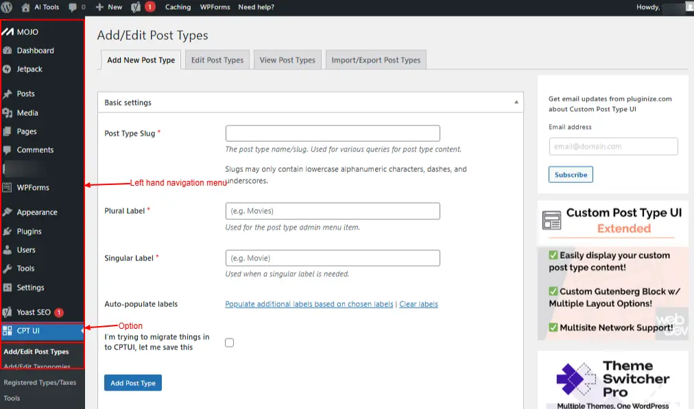 After installing the Custom Post Type Plugin, you will see the option of CPT UI in the left-hand navigation Menu.