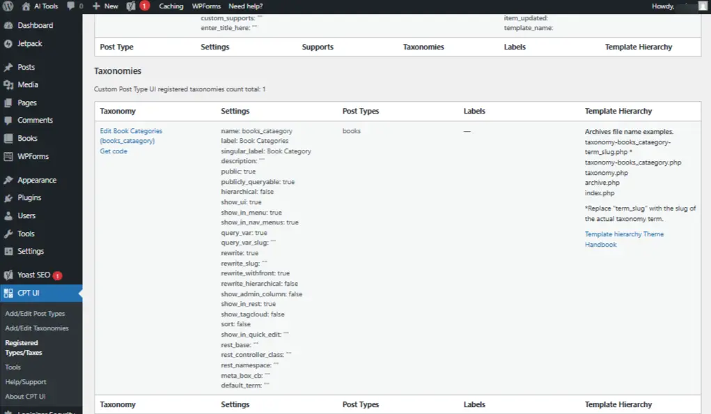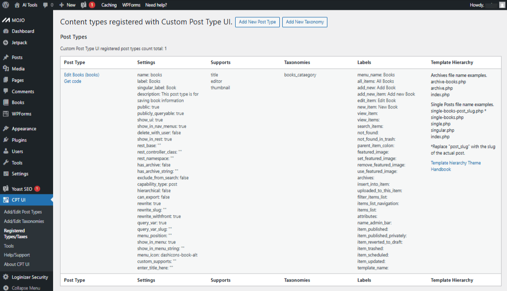 All the Custom post types registered with CPT UI plugin can be viewed here. You can view the following data: Taxonomy Settings, Post Types, Labels, Template Hierarchy.