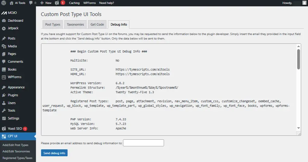 If you’ve requested support for Custom Post Type UI on the forums, you may be asked to send the information below to the plugin developer.