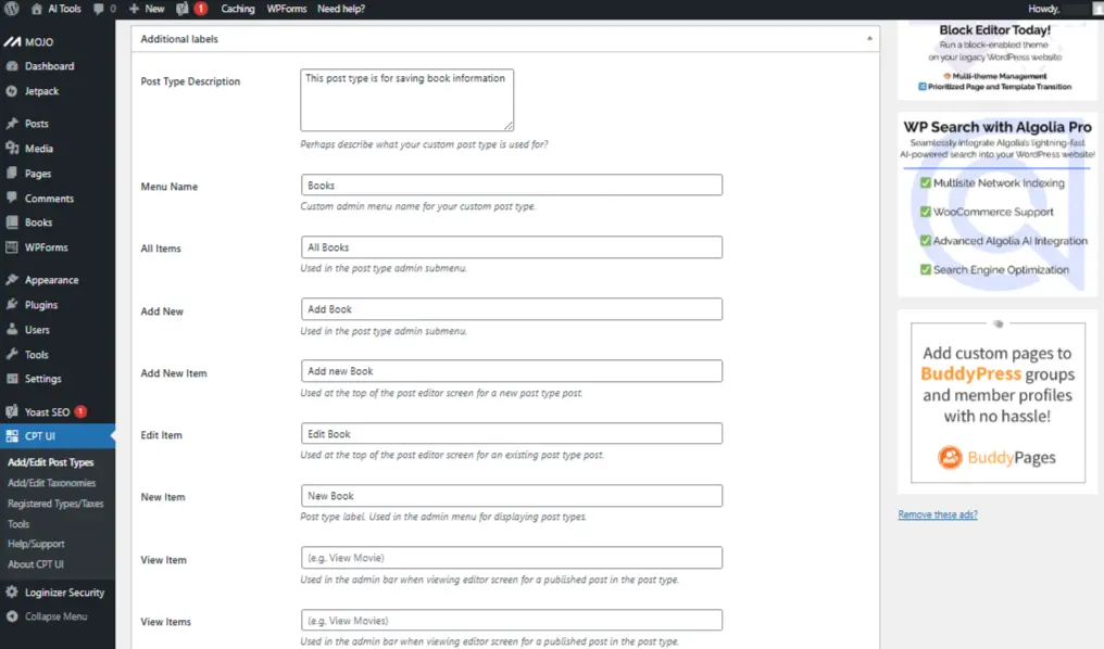- Plural Label: Enter the plural label for e.g, Books.Displayed as the label for the post type in the admin menu.