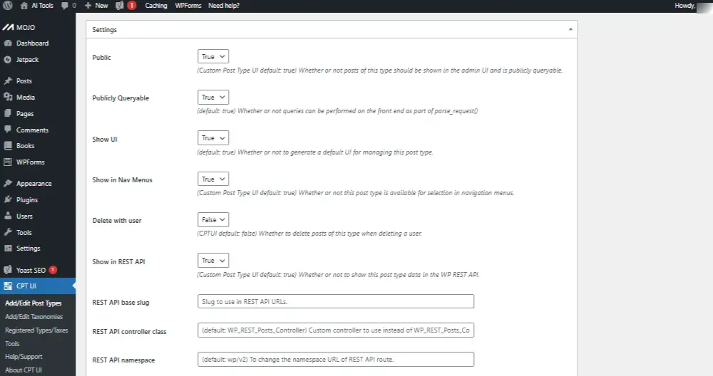 - Show in REST API: (Default: true) Determines whether this post type’s data is included and accessible through the WordPress REST API.