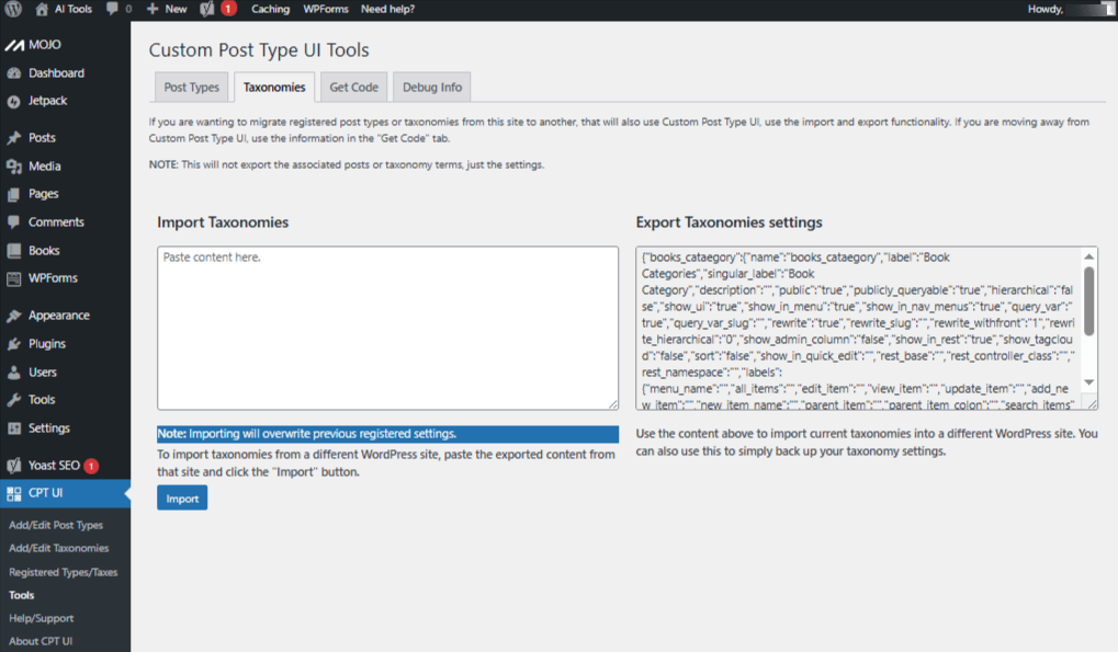 - Import Taxonomies: Importing will overwrite any previously registered settings. To import taxonomies from another WordPress site, paste the exported content from that site and click the ‘Import’ button.